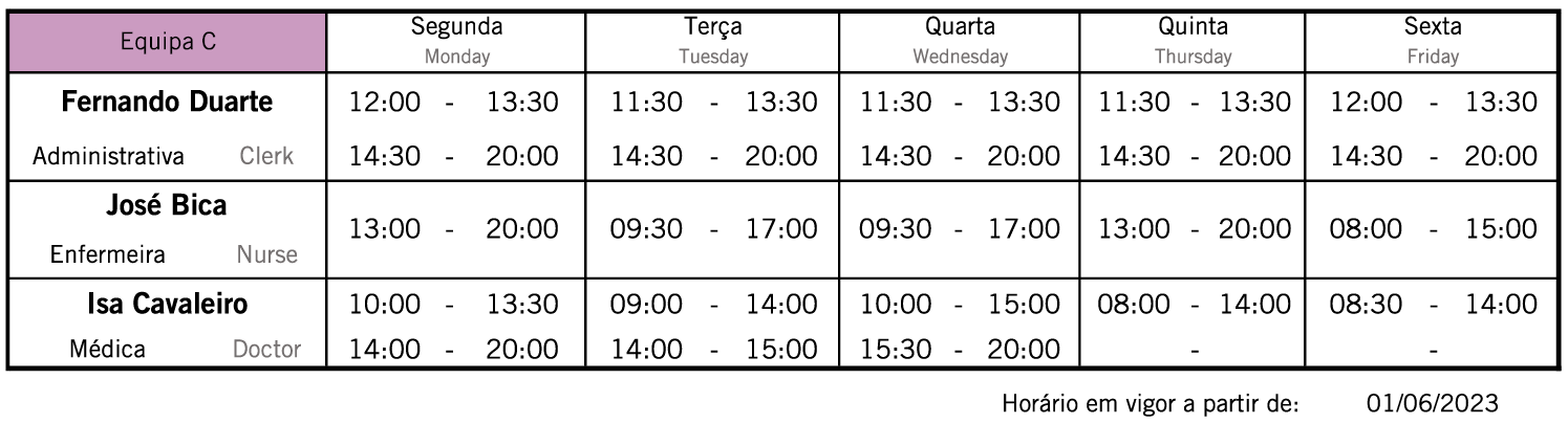 Notas: os horários podem sofrer alterações pontuais ou serem adaptados conforme a necessidade da equipa.