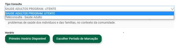 Através do Portal poderá escolher a marcação de uma consulta presencial (Saúde Adultos Programada pelo Utente) ou telefónica (Teleconsulta - Saúde Adulto).